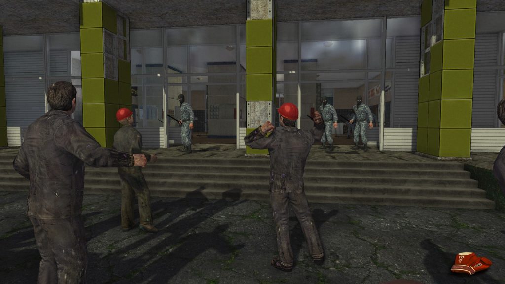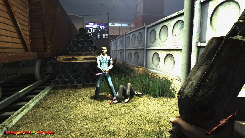 Дальше Фёдор направился к складу и где-то с помойки взял глушитель какого-то автомобиля и солнцезащитные очки. Идя дальше по территорию склада, Фёдор сталкивается с какими-то ботанами ((рис. 4) в файлах игры разработчики называют их метросексуалами) и давай их пиздить. Причём начиная с этого уровня, добавили нам возможность пострелять, для этого разрабы добавили стреляющие NPC.