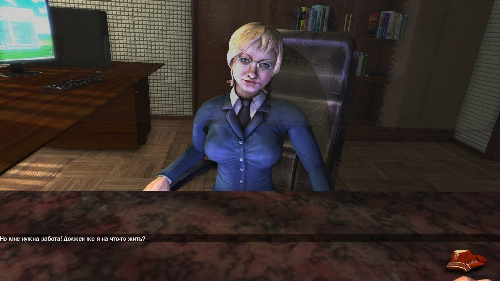 В конце первого уровня, главному герою в центре занятости населения отказала какая-то баба (рис. 3) в поиске работы по специальности инженера чего-то, дескать иди лучше работай в магазине. Потом Фёдор, уходя к выходу встречает какого-то чувака и тот предлагает для него работу грузчиком и Фёдор соглашается.