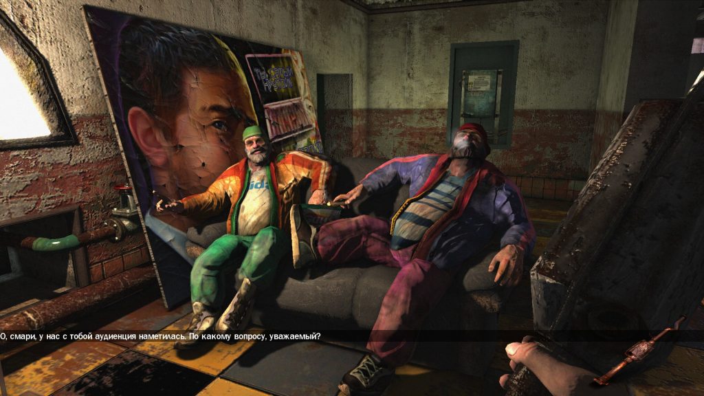 Дальше по-пути Фёдор встречает двух бомжей ака Сифон и Борода. Только эти бомжи живут не в одной из рублёвской помойки, а в каком-то подвале на цокольном этаже, смотрят плоский телевизор (для 2009 года было очень актуально, уступая старому ЭЛТ-телевизору), жрут чипсы Gays (пародия на Lays) и у них есть кухня, правда в виде склада. Мда. А до этого один из бывших сотрудников завода говорил, что бомжам в Москве проще живётся, чем в Воронеже, хотя игра показывает их обратно. Пока не пришёл какой-то охранник с револьвером и не пульнул их. Суки…