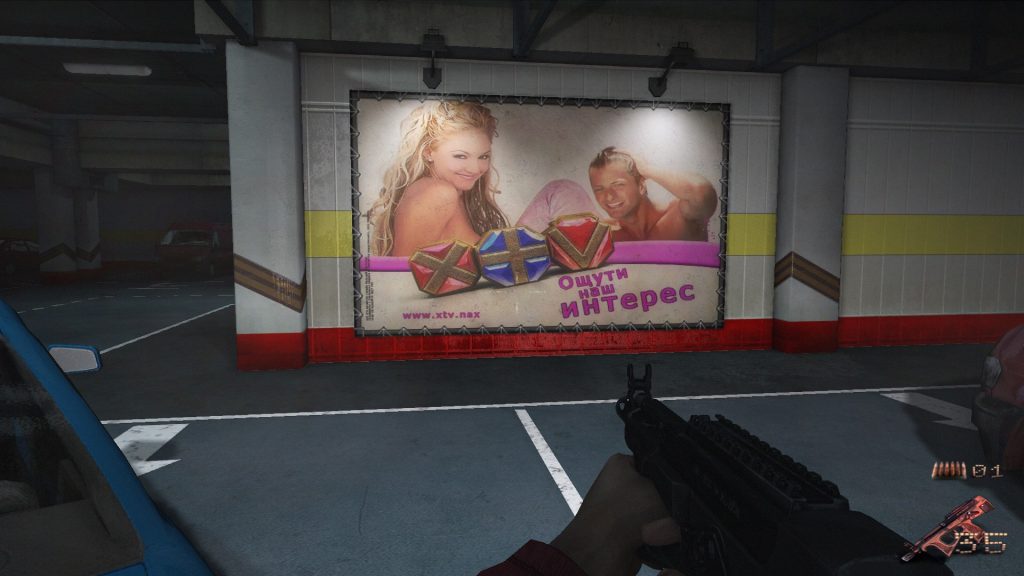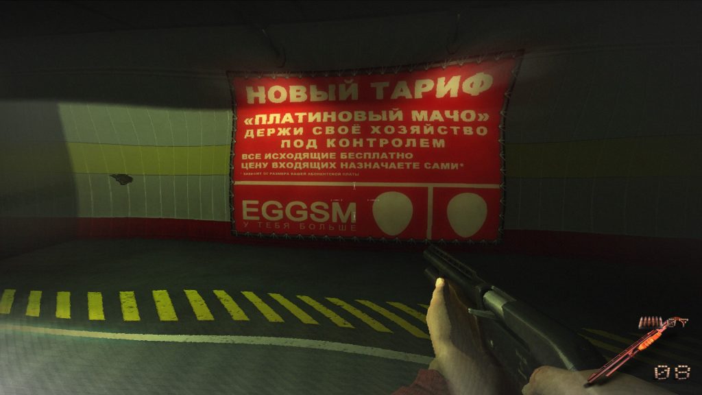 - Меняются рекламные плакаты аля тариф «Платиновый мачо» от EGGSM (пародия на логотип с яйцом МТС, которые сами люди из оттуда как дети начинают говорить мол, вы нечё не понимайте, это эллипсоид, а не яйцо. Во общем сотрудники Моторно-тракторной станций — элиты, а Вы все говно), телеканал XTV со слоганом «Ощути наш интерес» (пародия на телеканал ТНТ со слоганом «Почувствуй нашу любовь») и прочих Беломорканалов на плакаты текстом аля «Пей, колись, плодись, тупей, животное», «Потребляй больше — умри раньше. Твоя цель — деньги», «Не думай! Не чувствуй! Твои мысли — то что мы говорим! Твои интересы — то что мы показываем» и так далее и тому подобное.